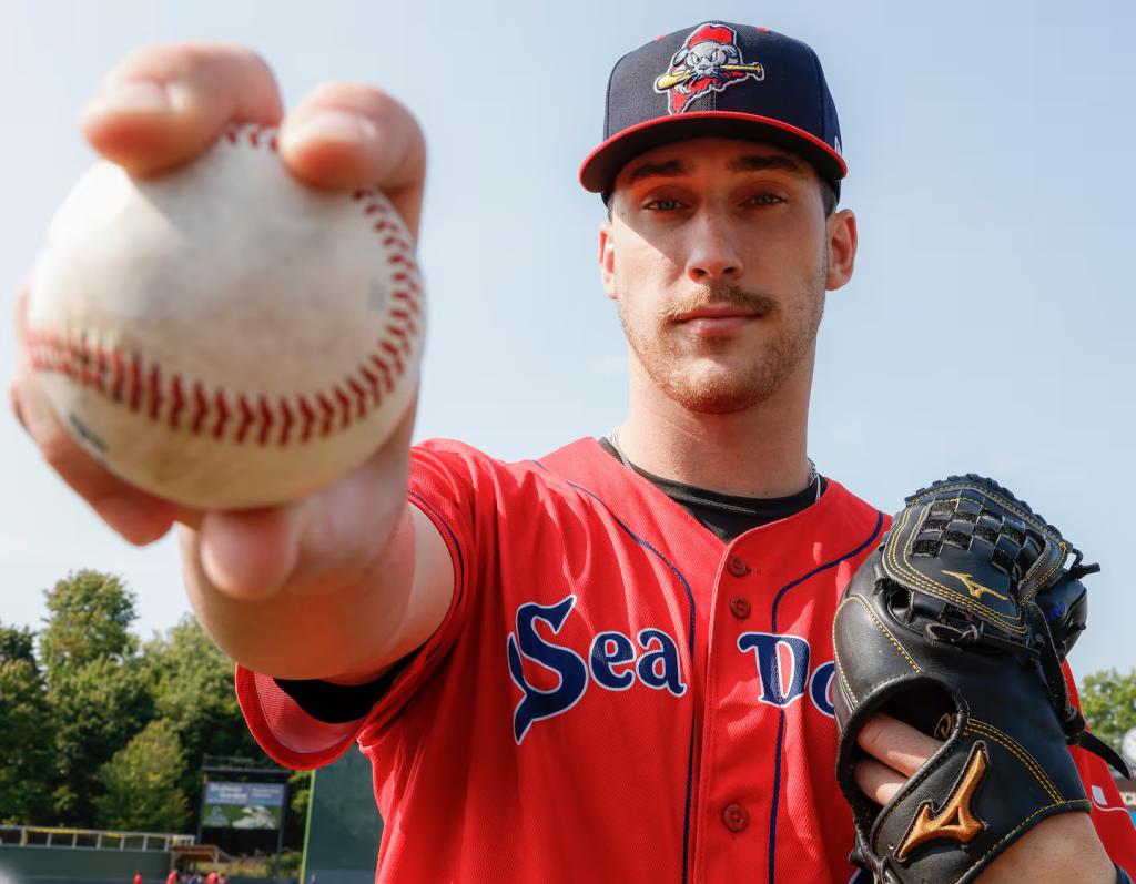 Boston Red Sox prospect David Sandlin answers questions inside the Red Sox clubhouse at Fenway Park during Red Sox Rookie Development Week in Boston earlier this year. | WooSox Photo/Ashley Green / USA TODAY NETWORK via Imagn Images