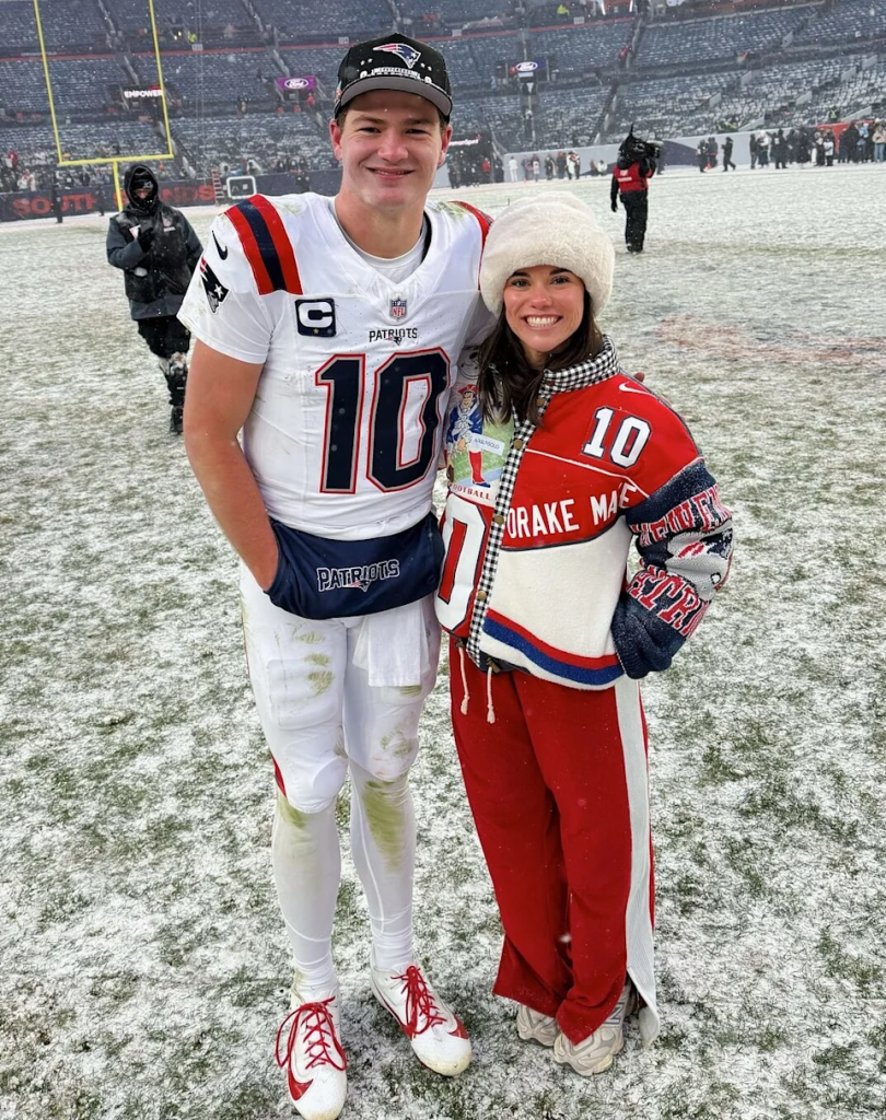 An NFL social media clip captured Maye reuniting with his wife, Ann Michael Maye, on the frozen field at Empower Field at Mile High. She rushed toward him, visibly emotional, arms wrapped tight in celebration. Maye responded with a brief embrace — and a gentle pat on her back.
