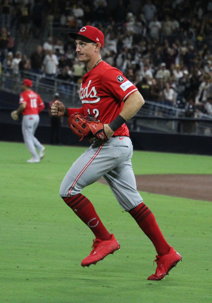 Sep 8, 2025; San Diego, California, USA; Cincinnati Reds left fielder Austin Hays (12) celebrates after hitting a solo home run during the sixth inning against the San Diego Padres at Petco Park. Mandatory Credit: Denis Poroy-Imagn Images | Denis Poroy-Imagn Images