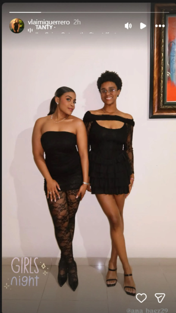 In the image, Vlaimy posed alongside her friend Ana Ortiz, both dressed in black, standing calmly, legs crossed at the ankles, eyes fixed on the camera.