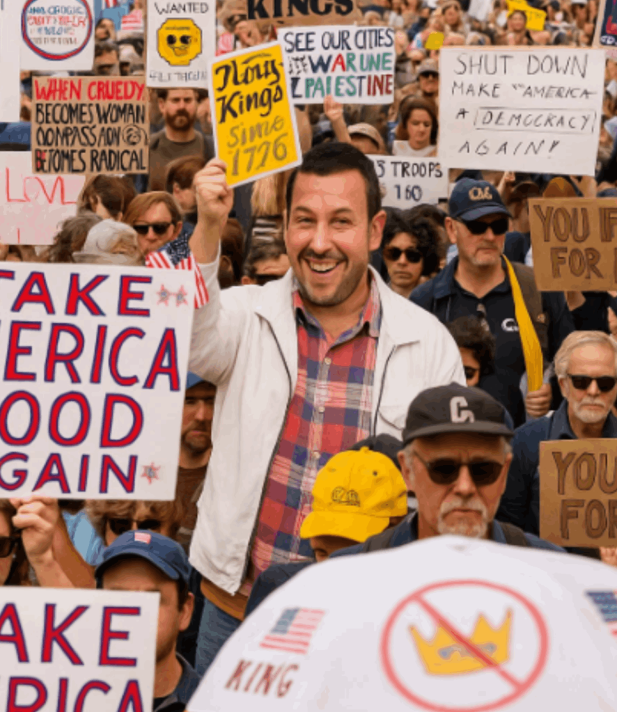 In a moment that has sent shockwaves across social media and beyond, Hollywood icon Adam Sandler was reportedly spotted joining millions of Americans in the historic “No Kings” protests against President Donald Trump. The massive nationwide demonstrations, which drew record crowds on October 18, 2025, marked one of the largest displays of public dissent in recent history – and Sandler’s alleged appearance has turned heads, sparked debates, and left fans in utter disbelief.