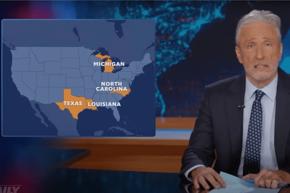 “It’s America’s new gender reveal tradition,” Stewart joked. “‘Boom! It’s blue! Ha ha! I’m so happy to blame you! For violence!’ The game is so ubiquitous, now it’s often played before we even know who the perpetrator is.”