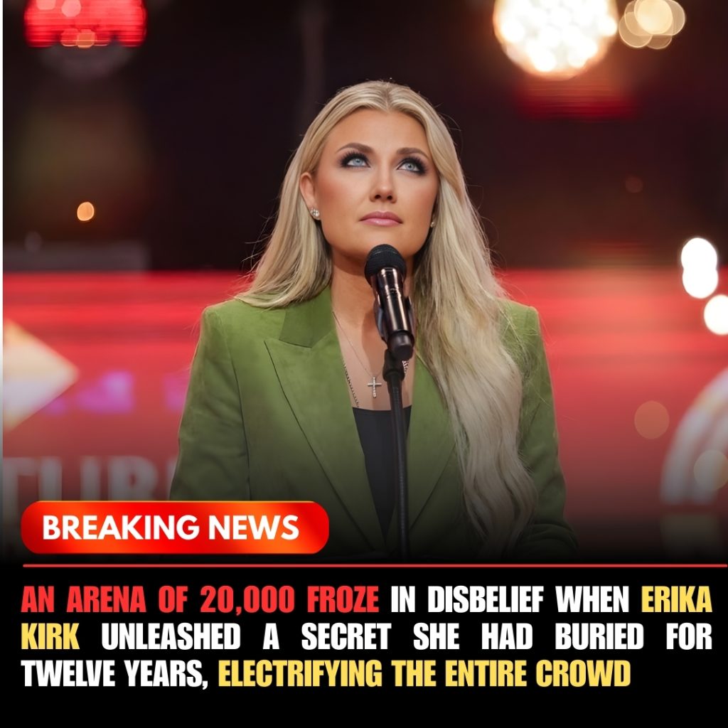 She took a deep breath, her hands clenching and unclenching, and for the first time in over a decade, Erika Kirk spoke not as a performer, but as a human being burdened with truth. “There’s something I’ve kept from all of you… something I’ve carried for twelve years,” she said, her voice shaking but resolute. A hush fell over the arena, the kind that makes every heartbeat thunder in your ears. The 20,000 fans didn’t cheer. They didn’t murmur. They froze, collectively holding their breath as if the world itself had paused.