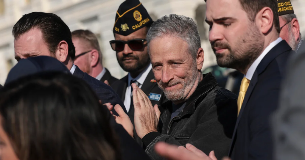 Comedian Jon Stewart ripped into the eight senators who voted with Republicans to end the government shutdown without securing an extension of health insurance tax credits — a key Democratic demand.