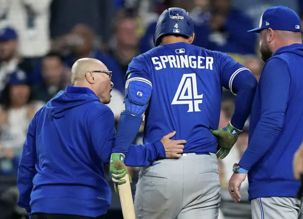 Springer suffered the injury during Monday’s marathon Game 3, which the Blue Jays eventually lost to the Dodgers 6-5 in 18 innings. In the seventh inning, Springer after fouling off a pitch immediately clutched his right side in obvious discomfort. Soon after he exited the game accompanied by a trainer and was replaced by Ty France: