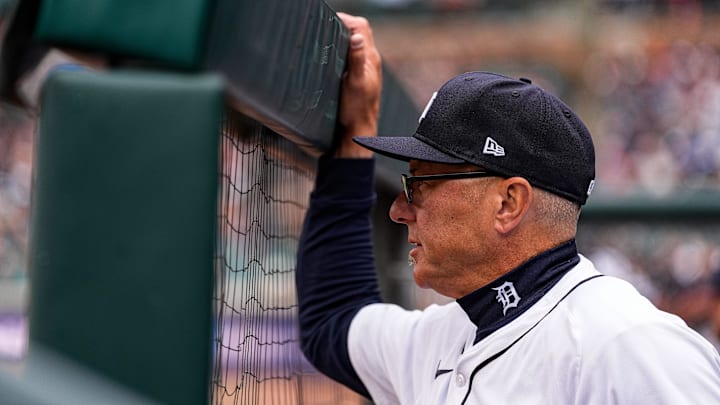 Detroit Tigers first base coach Anthony Iapoce (76) watches warm up from the dugout before Game 2 of AL wild-card series against Cleveland Guardians at Progressive Field in Cleveland, Ohio on Wednesday, Oct. 1, 2025. | Junfu Han / USA TODAY NETWORK via Imagn Image