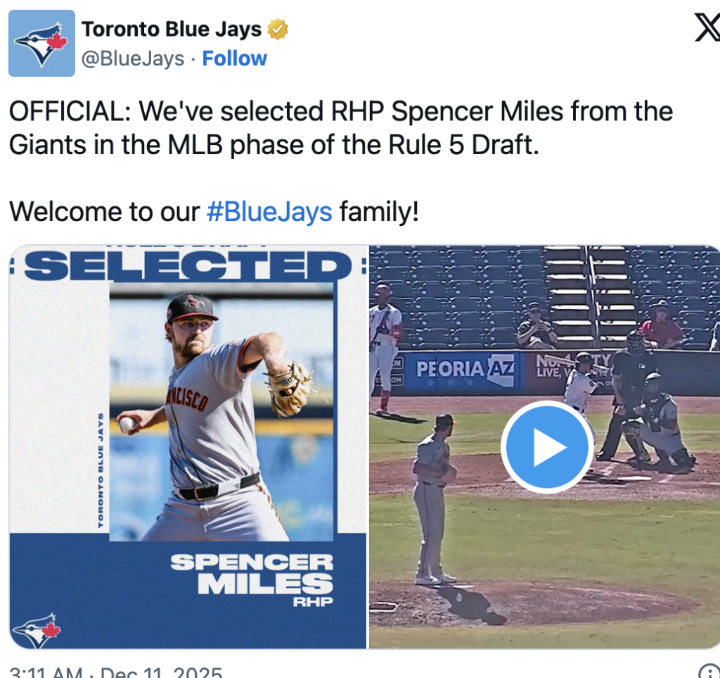 Like all Rule 5 picks, Miles must stay on the Blue Jays’ 26-man big-league roster all season or be returned to the team he was selected from.
