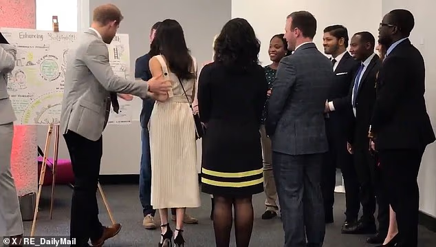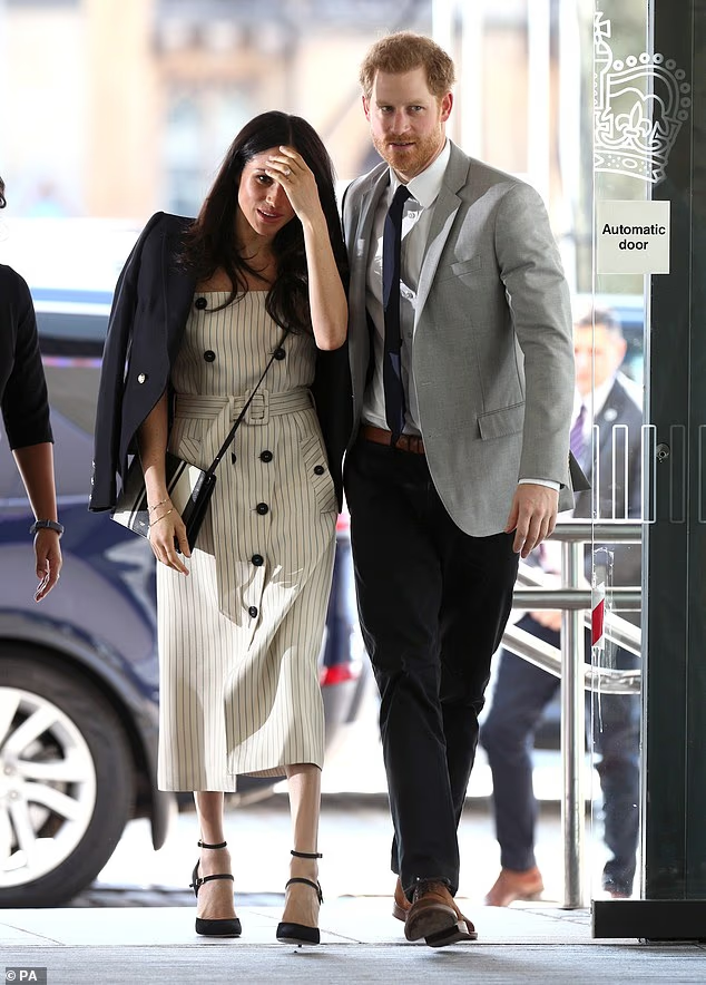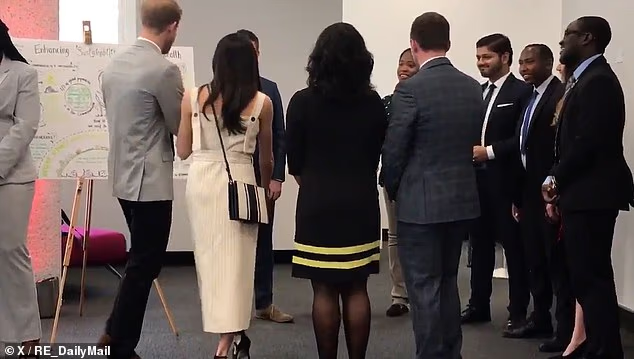 ‘Harry dutifully steps back to usher Meghan through, using a rather old-fashioned gallant steering gesture to do so.